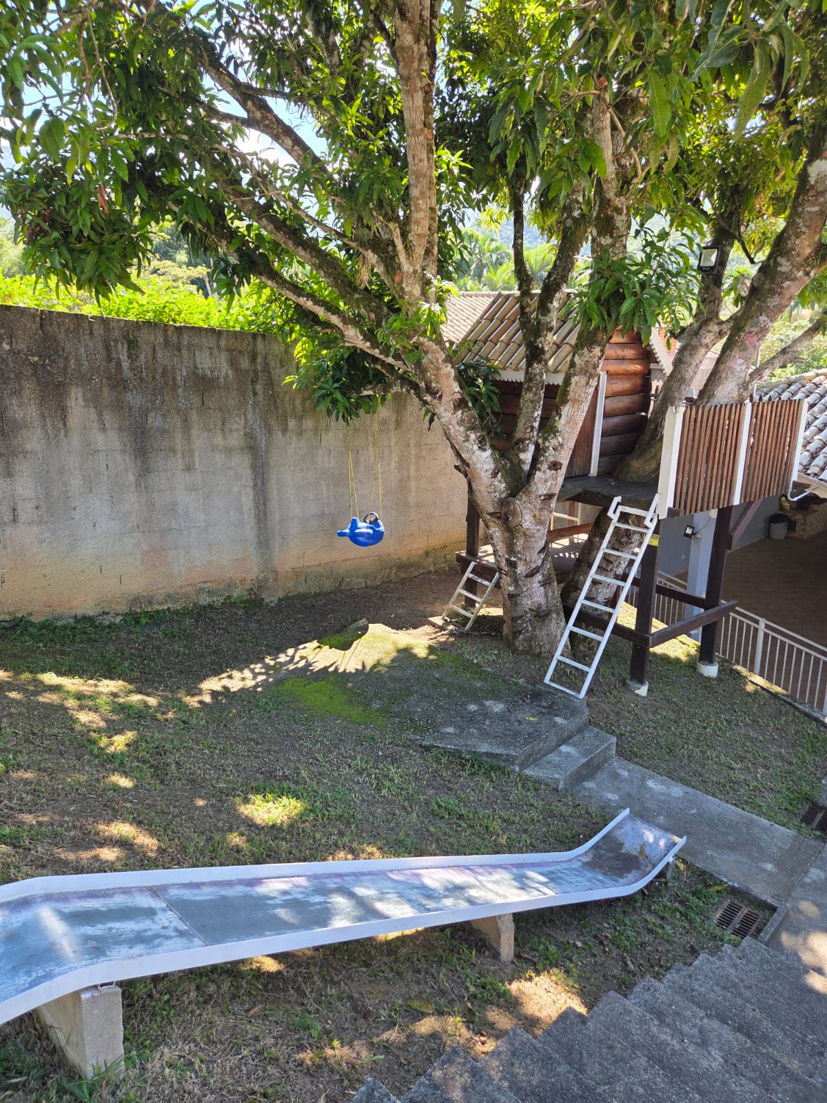 - casa na árvore, com iluminação externa e interna, escada fixa, escada móvel, dois pisos, lousa com giz na área interna, balanço para crianças menores.